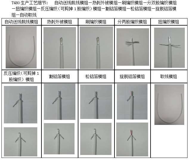 生產(chǎn)工藝細(xì)節(jié): 自動送線裁線模組—熱剝外被模組—刷編織模組—分雙股編織模組—扭編織模組—反壓編織(可剪掉1股編織)模組—割鋁箔模組—松鋁箔模組—旋脫鋁箔模組—自動取線